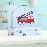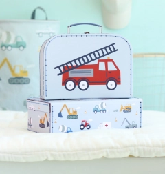 Objavte praktickú a krásnu sadu dvoch kartónových kufríkov A Little Lovely Company s atraktívnym motívom vozidiel. Vďaka pevnému spracovaniu a premysleným detailom sa skvele hodia do detskej izby aj na cesty.