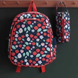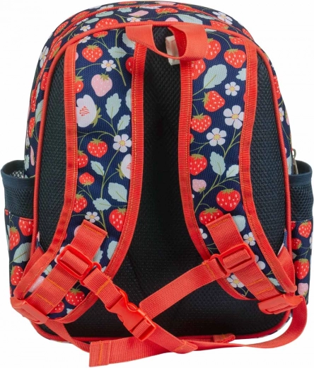 Štýlový detský batoh s motívom jahôd je ideálny do škôlky, školy aj na výlety. Ponúka priestrannú hlavnú komoru, izolované predné vrecko na desiatu, bočné vrecká na fľašu a polstrované popruhy s hrudným pásom pre pohodlné a bezpečné nosenie.