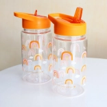 Priehľadná detská fľaša na pitie s veselým motívom dúhy a objemom 450 ml je ideálna do škôlky aj na výlety. Vďaka materiálu Tritan je ľahká a odolná, uzáver so slamkou zabezpečuje nepriepustné a pohodlné pitie. Skvele doplní sadu v rovnakom dizajne – fľaša, batoh a box na desiatu.