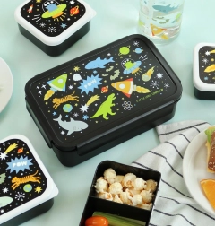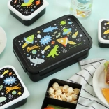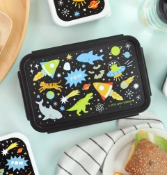 Štýlová detská dóza na desiatu s vesmírnym motívom je ideálna do školy aj na výlety. Má vzduchotesné zacvakávacie veko, vyberateľnú nádobku s dvoma priehradkami a objem 1,2 l na prehľadné a čerstvé uloženie desiat po celý deň.