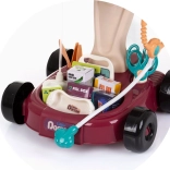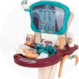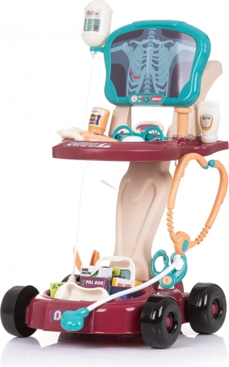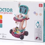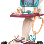 Vozík je prehľadne členený policami na vybavenie a obsahuje širokú sadu doplnkov: stetoskop, infúziu, kyslíkovú masku s fľašou a ďalšie potrebné nástroje pre malých doktorov. Vďaka kolieskam a kompaktným rozmerom 58 × 42,5 × 32 cm je ľahko premiestniteľný a stabilný pri hre.