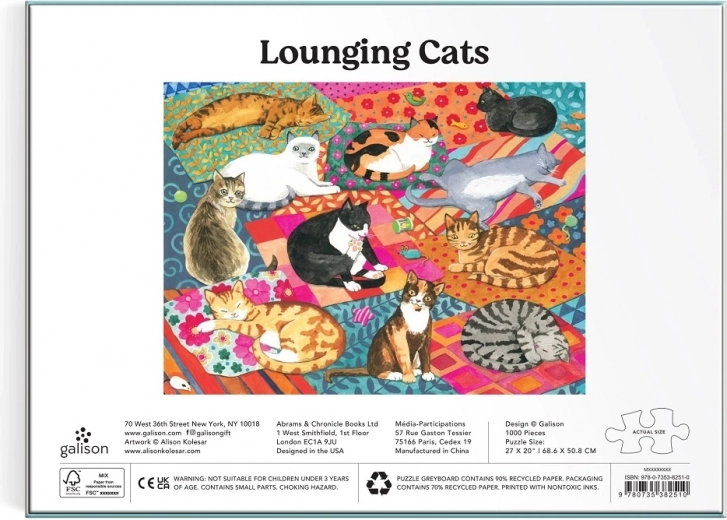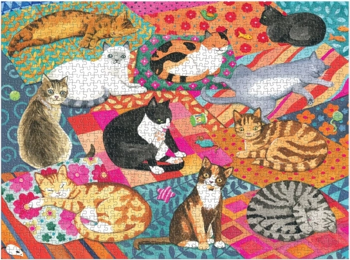 Užite si relax s krásnymi puzzlami GALISON s motívom od ilustrátorky Alison Kolesar. Skladačka s 1000 dielikmi zobrazuje rozkošné mačky na farebných prikrývkach a vankúšoch, vyrobená z recyklovaných materiálov, s matnou povrchovou úpravou, netoxickými atramentmi a špičkovou potlačou pre živé farby a detail.