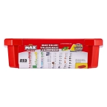 Robustný červený úložný box s vekom v štýle stavebných kociek poskytuje priestor pre prenos a uskladnenie všetkých 253 dielov.