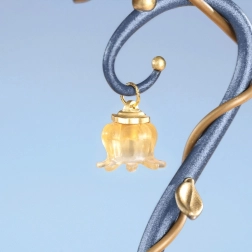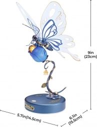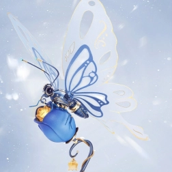 Tento detailne prepracovaný mechanický motýľ sedí na púčiku ruže, ktorá je spojená so stabilnou základňou dekoratívnym kovovým stonkom. Krídla z tenkého PVC (0,15 mm) zdobia elegantné vzory v farbe šampanského a zadnú stranu telíčka zvýrazňuje trblietavý „drahokam“. Po zapnutí sa motýľ roztancuje – máva krídlami, ruža jemne zlatisto svieti a tykadlá sa rozblikajú.