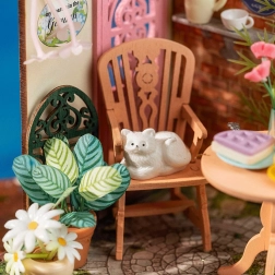 Miniatúra je vybavená precízne vyrezanými prvkami, ktoré zahŕňajú stoličku, stôl s kanvicou a šálky, dekoratívne rastliny a plot.