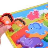 Drevená vkladačka Safari spája hranie s učením. Deti si precvičujú schopnosť porovnávania a koordináciu, zatiaľ čo sa učia názvy zvierat zo zoologických záhrad. Vkladačka je vyrobená z kvalitných materiálov, nemá ostré hrany, čo zabezpečuje bezpečnosť. Veľké, masívne dieliky možno ľahko uchopiť a vložiť do otvorov.