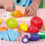 - Doštička, nôž, 6× ovocia (banán, hruška, jahoda, pomaranč, mandarínka, citrón), 4× zeleniny (mrkva, baklažán, brokolica, paradajka), ryba