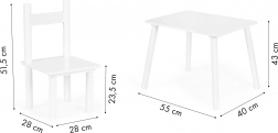 Stôl: 55 × 40 × 43 cm. Stolička: výška 51,5 cm, šírka 28 cm, výška sedadla 23,5 cm. Ergonómia pre pohodlie a správne sedenie detí od 3 rokov.