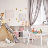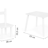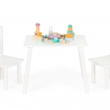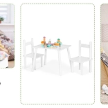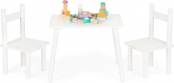 Vytvorte deťom vlastný kútik na hranie a učenie. Biely drevený set ECOTOYS kombinuje jednoduchý škandinávsky dizajn s odolným spracovaním: masívne borovicové nohy zabezpečujú stabilitu a doska z MDF sa ľahko udržiava v čistote. Sada obsahuje stôl a dve pohodlné stoličky so zladenými proporciami.