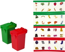 Farebné koše a kartičky s predmetmi robia z hry poučnú aktivitu plnú zábavy.