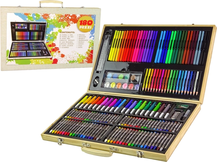 Naša výtvarná sada obsahuje pre každého niečo – omaľovánky, pastelky na kreslenie a farby na maľovanie. Všetko v sýtych farbách, ktoré na papieri vyzerajú skvele. Sada sa dodáva v praktickom kufríku, ktorý možno ľahko zložiť, zavrieť a vziať so sebou – do školy, škôlky, na hodiny výtvarnej výchovy alebo na výlet za maľovaním do prírody! Výtvarná sada je určená nielen pre deti. Bohatá paleta farieb a rôzne druhy náradia sa osvedčia pri skicovaní, vyfarbovaní a mnohých ďalších prácach.
