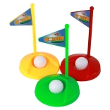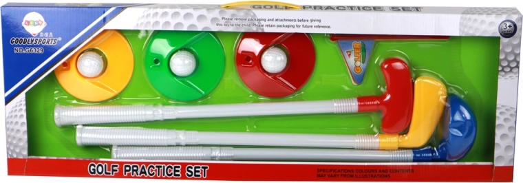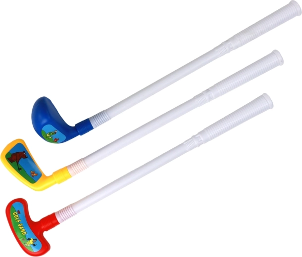 Táto farebná sada na minigolf ponúka všetko, čo deti potrebujú na hru: 3 odolné palice (cca 52 cm), 3 jamky vo farbách zelená, červená a žltá, 3 štartovacie vlajočky a 3 biele loptičky (priemer cca 3,5 cm). Každá palica má iný tvar hlavy, čo pridáva hre stratégiu a pestrosť.