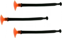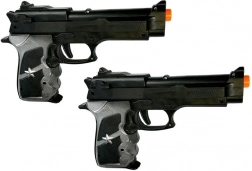Dve čierne hračkárske pištole so šedými rúčkami a oranžovými špičkami pre bezpečnosť, zaručujúce realistické, ale bezpečné hry.
