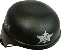 Čierna prilba s bielym emblémom a nápisom 'POLICE' je ideálna pre ochranu, vyrobená z odolného plastu s nastaviteľným podbradným páskom.