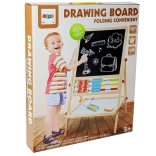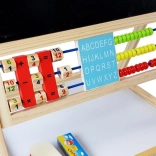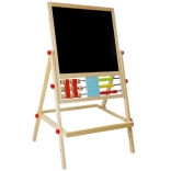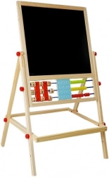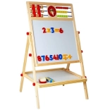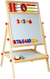 Tabuľa je nevyhnutnou výbavou, malá umelkyňa bude rozvíjať výtvarné zručnosti kreslením kriedami, môže sa tiež učiť písať a počítať. Je vybavená praktickou poličkou na príslušenstvo. Robustne vyrobená z materiálov najvyššej kvality. Starostlivo spracovaná, takže nemá žiadne ostré hrany. Na kreslenie na čiernu stranu tabule použite kriedy – súčasťou balenia sú tri farby. Má počítadlo s 3 farbami guličiek, s ktorým dieťa začne dobrodružstvo počítania, a na druhej strane drevené kocky s číslami, s ktorými môže ľahko vykonávať základné matematické operácie. S číslami a matematickými znakmi na magnete sa môže naučiť základné matematické operácie, ako je sčítanie, odčítanie a násobenie. V strednej časti sú hodiny, na ktorých batoľa pomocou ručičiek nastaví čas a rozpozná hodiny.