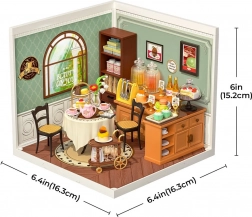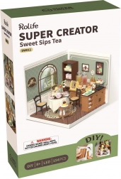 Miniatura Sladká čajovňa je ideálna, ak máte chuť na štýlový oddych v prostredí so starožitnou atmosférou, kde nechýba okrúhly stolík s krajkovým obrusom, hrnčekmi a tanierikmi plnými sladkostí. Jednoduché zloženie bez použitia lepidla je podporené presne vystrihnutými dielikmi, ktoré sa ľahko zasúvajú.