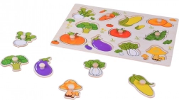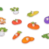 Skladačka obsahuje 11 farebných kúskov predstavujúcich rôzne druhy zeleniny, ako je repa, mrkva, kukurica a ďalšie.