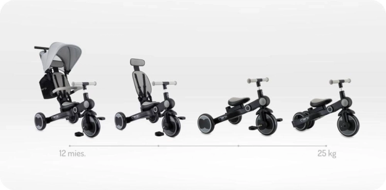 - 4v1 dizajn kombinujúci trojkolku, odrážadlo a balančný bicykel