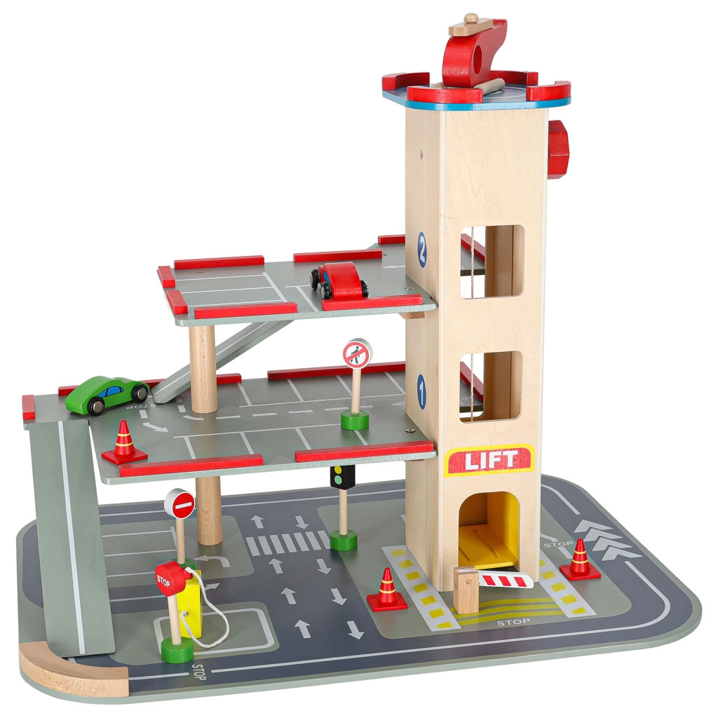 Táto kvalitná drevená garáž ponúka až 4 úrovne zábavy: tri poschodia na parkovanie a strešný heliport. Vďaka ručne ovládanému výťahu deti ľahko presunú autíčka medzi poschodiami a môžu využívať aj plynulé rampy. Set je ideálny na rozvoj jemnej motoriky, fantázie a učenie sa pravidlám cestnej premávky.