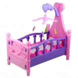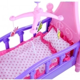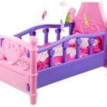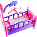 Táto štýlová postieľka pre bábiky verne pripomína skutočnú detskú postieľku. Ružovo‑fialové prevedenie so srdiečkami a ornamentmi dopĺňa kolotoč s visiacimi zvieratkami, vďaka ktorému bábika ľahko zaspí. Súčasťou je mäkká posteľná bielizeň zladená s dizajnom postieľky.
