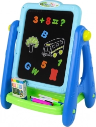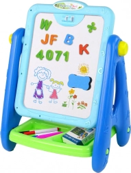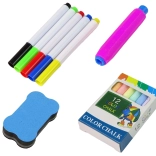 V sade nájdete kompletné balenie: samotnú tabuľu s nožičkami, 5 rôznych farebných fixiek (modrá, červená, žltá, zelená, čierna), praktickú hubku na stieranie a tiež 12 farebných kried (2 od každej farby) na písanie na čiernu stranu. Kryt na kriedy navyše umožňuje kresliť bez toho, aby ste si zašpinili ruky, a sada magnetov s písmenami, číslicami a znakmi poskytuje dynamickú a interaktívnu výučbu.