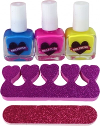 - **3 laky na nechty v ružovej, žltej a modrej farbe**: deti môžu vyberať z rôznych farieb a vytvárať rôzne vzory.