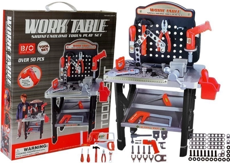 Táto sada zahŕňa pracovný stôl s viac ako 50 dielmi, vrátane vŕtačky, kľúča a ďalších hračiek, ktoré deťom umožnia cítiť sa ako skutoční kutilovia.