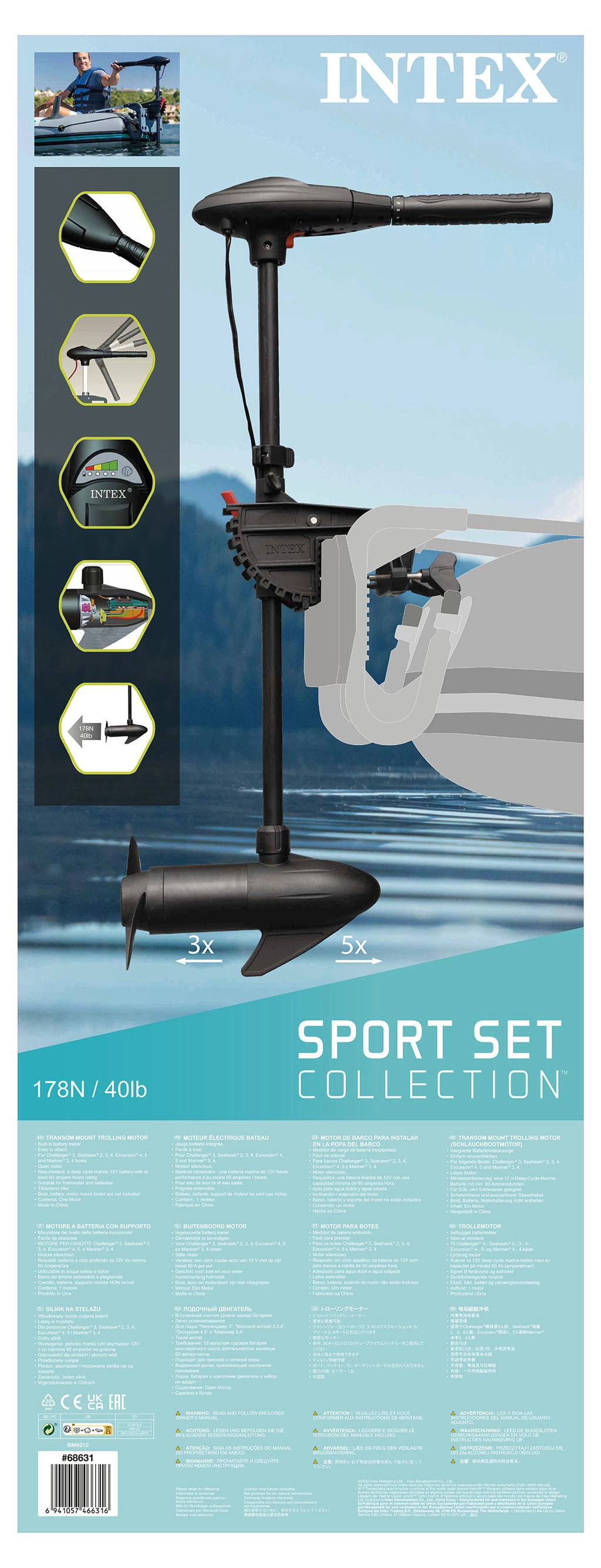 Motor s výkonom 420 W pracuje na 12 V jednosmerného jednofázového napájania a je navrhnutý pre rýchlu montáž na zrkadlo väčšiny nafukovacích člnov značiek Seahawk, Excursion, Seahawk II, Mariner a Challenger. Odolná konštrukcia je vhodná aj do slannej vody, takže sa nemusíte báť výletov na mori či v brakických vodách.