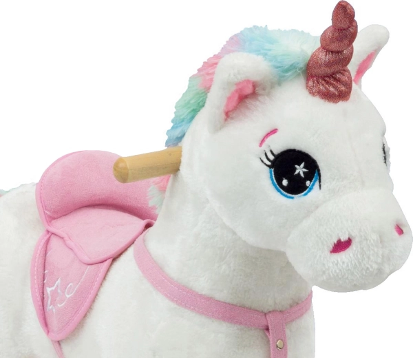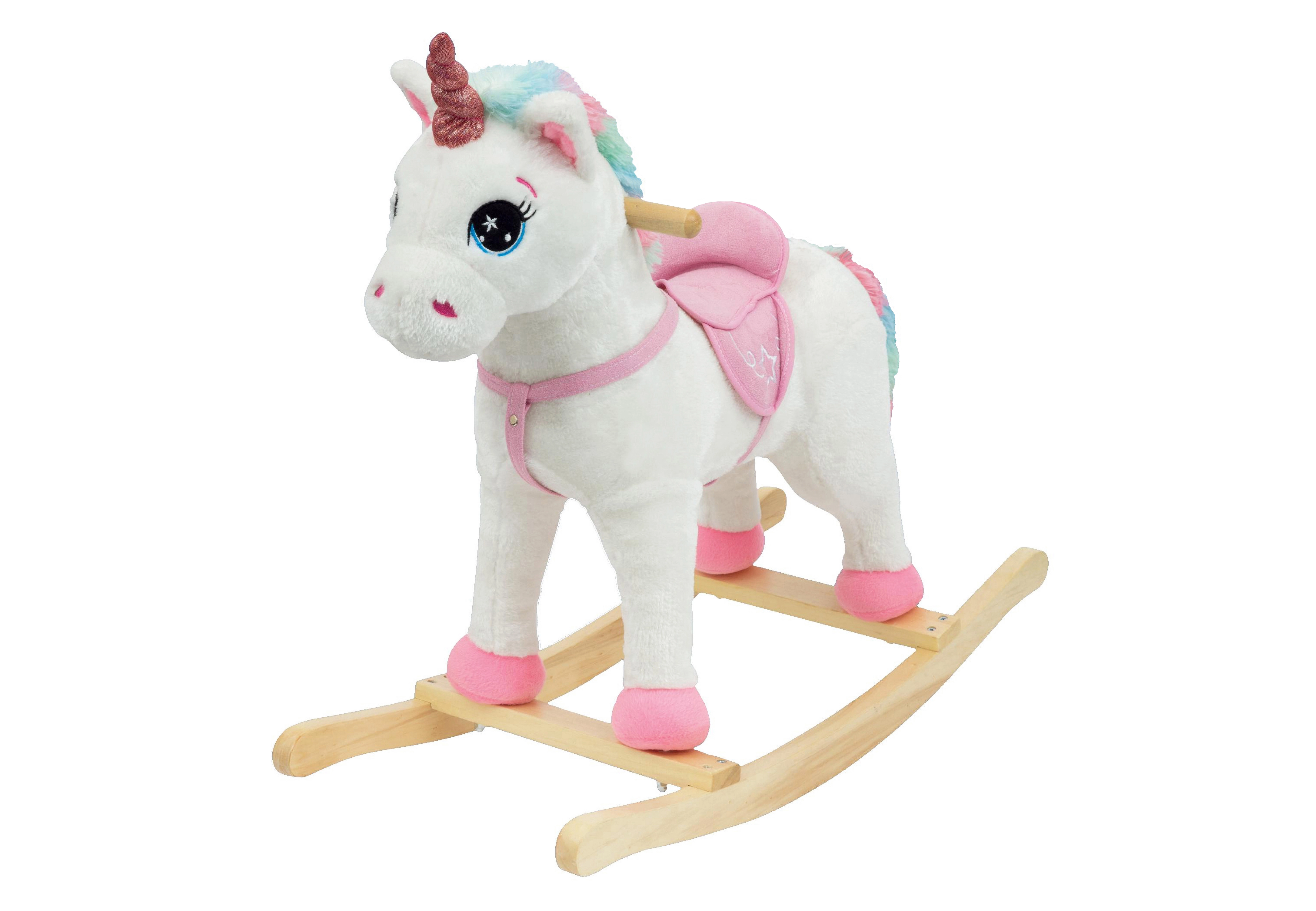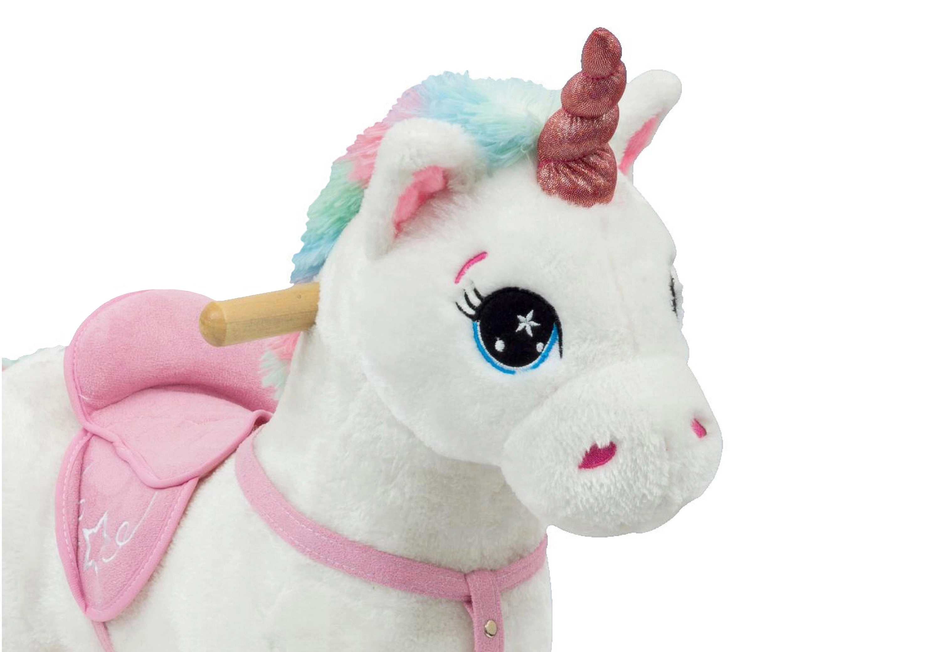 Tento pôvabný hojdací jednorožec v bielo-ružovom prevedení očarí každé dieťa. Hebký plyš je príjemný na dotyk, drevená hojdacia základňa poskytuje stabilitu a integrované zvukové efekty podčiarkujú čarovný zážitok z jazdy. Ideálny pre deti od 3 rokov, ktoré sa chcú hrať a zároveň rozvíjať motoriku a rovnováhu.