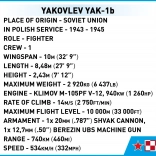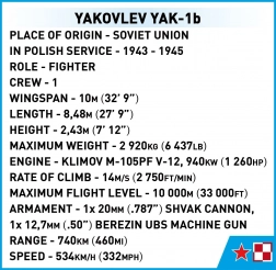 S touto stavebnicou môžete postaviť historický model stíhacieho lietadla Jakovlev Jak-1b, ktoré slúžilo v letectve počas 2. svetovej vojny. Vďaka svojmu elegantnému dizajnu a jednoduchej údržbe bolo obľúbené u pilotov a pozemného personálu. Toto lietadlo, známe svojou vynikajúcou schopnosťou výkonu vďaka dobrému pomeru výkonu k nízkej hmotnosti, bolo obávaným súperom vo vzduchu.
