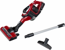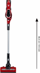 Detský vysávač Bosch Unlimited je vyrobený v červenej farbe s čiernymi prvkami a sivou rúrkou, čo zaručuje autentický vzhľad. Je vybavený zelenou LED kontrolkou, ktorá signalizuje zapnutie, a pohyblivou podlahovou kefkovou hlavicou s točivým valčekom pre účinnejší zber nečistôt.