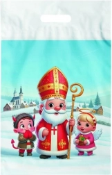 Ozdobná igelitová taška s potlačou Mikuláša, anjela a čerta je ideálna na balenie mikulášskych nadielok. Veľkosť 29×46 cm poskytuje dostatok priestoru na sladkosti, hračky aj väčšie darčeky a poteší výrazným, veselým motívom.