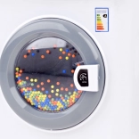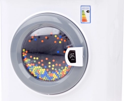 Priehľadné dvierka umožnia vidieť farebné guľôčky v bubne, ktorý sa pri praní točí a simuluje vodný efekt.