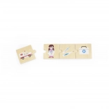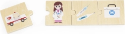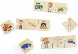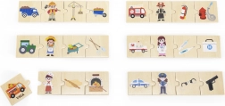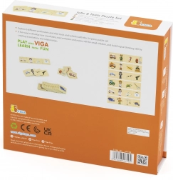 Detská vzdelávacia sada VIGA prináša 24 drevených dielikov s krásnymi ilustráciami, vďaka ktorým sa deti hravou formou zoznámia so 6 povolaniami – napríklad hasič, lekár, policajt, poľnohospodár, stavbár či pekár – a priradia k nim správne nástroje a vozidlá. Farebné obrázky podporujú učenie nových slov a rozširujú slovnú zásobu.