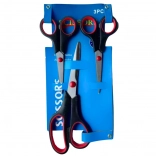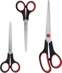 Praktická sada troch univerzálnych kancelárskych nožníc na každodenné použitie v domácnosti, kancelárii aj dielni. Obsahuje veľkosti 20 cm, 14 cm a 12,5 cm na rôzne úlohy. Ostré čepele z nehrdzavejúcej ocele zabezpečujú hladký a presný strih, ergonomické plastové rukoväte poskytujú pohodlné držanie aj pri dlhšej práci. Sada je odolná voči korózii a má certifikáciu CE.
