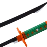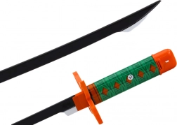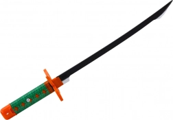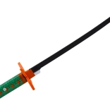 Tento samurajský meč pre deti verne napodobňuje legendárny štýl nichirin – má čiernu čepeľ a oranžovo‑zelenú rukoväť s geometrickým vzorom pre pevný a pohodlný úchop. Bezpečné plastové ostrie s dĺžkou cca 40 cm a rukoväť cca 15 cm podporujú bezpečnú a kreatívnu hru.