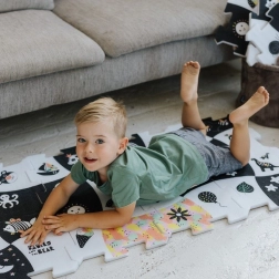 Pěnové puzzle TREFL s postavičkami Treflíkov je skvelým riešením pre bezpečné a pohodlné hranie. Špeciálny materiál podobný hrubej karimatke alebo viacvrstvovému mirelonu zaisťuje výborné tlmenie nárazov a príjemný došľap. Čiernobiele ilustrácie pôsobia pokojne a podnecujú sústredenie.
