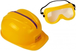 Žltá prilba a priehľadné okuliare poskytujú simuláciu ochrany pre bezpečné a realistické hranie.
