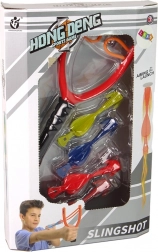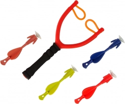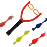 Balíček obsahuje červený prak a štyri farebné strely s prísavkami pre bezpečné hranie.