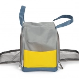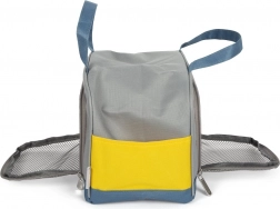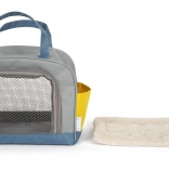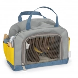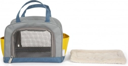 Sivá a modrá prepravná taška s dvojitými úchytmi a žltými vreckami je ideálnym riešením pre prenášanie malých domácich zvierat, zabezpečujúcim pohodlie a bezpečnosť vášho maznáčika.