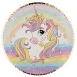 Vneste na stôl porciu kúziel s tanierikmi s dúhovým motívom jednorožca. Elegantný zlatý lem a jemne vrúbkovaný okraj dodajú vášmu stolovaniu štýl, či už chystáte narodeninovú párty, detskú oslavu alebo rozprávkovú tému.