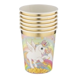 Tieto papierové poháre s kúzelným motívom jednorožca dodajú vašej párty rozprávkovú atmosféru. Vďaka praktickému objemu 250 ml sú ideálne na džúsy, limonády aj vodu. Elegantný zlatý lem doplní slávnostnú výzdobu stola a ľahko ich skombinujete s ďalšími párty doplnkami.