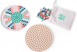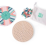 Drevená doska, pevné kolíky a bavlnená taška na prenášanie aj skladovanie. Hra vydrží mnoho hodín tvorivej zábavy.