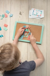 Obsah balenia: korková nástenka 19 × 29 cm, 10 kariet s predlohami 8 × 13 cm, 33 drevených tvarov, drevené kladivko. Vyrobené z kvalitného dreva, korku a kovu pre odolnosť a dlhodobé používanie.