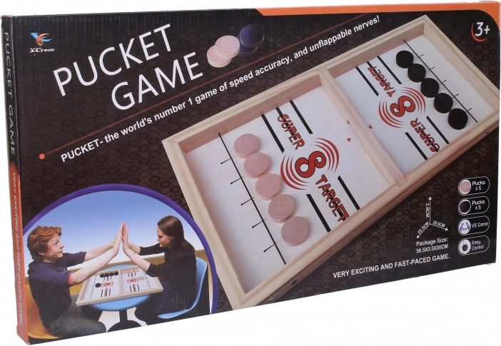 Predstavujeme vám drevený stolný hokej, perfektný pre každý rodinný večer alebo priateľské stretnutia. Táto hra je navrhnutá tak, aby sa do nej mohli zapojiť ako deti od 3 rokov, tak aj dospelí. Stačí si vziať päť pukov, napnúť šnúrku a pokúsiť sa ich čo najviac dostať na súperovu stranu.