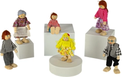 Kompletná rodinka 6 ks: starí rodičia, rodičia a deti. Rôzne výšky (cca 11,5 cm a 9 cm) podporujú učenie rolí a rodinných vzťahov.