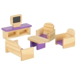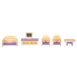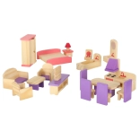 Štýlová sada dreveného nábytku do domčeka pre bábiky v odtieňoch fialovej a ružovej poteší každého malého dizajnéra. Obsahuje až 19 prvkov do obývačky, spálne, kúpeľne aj kuchyne. Vyrobené z kvalitného, hladko brúseného dreva a bezpečne lakované. Podporuje kreativitu, jemnú motoriku a realistickú hru.