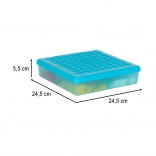 Praktický plastový box s priehradkami udrží všetky komponenty prehľadne roztriedené. Vďaka tomu je hra vhodná doma, v škôlke aj na cestách – rýchle rozloženie aj upratanie zaručené.