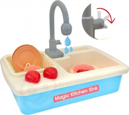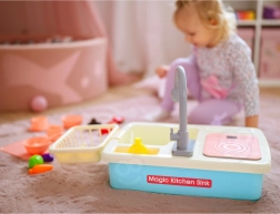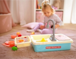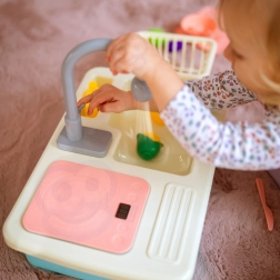 Vstavané čerpadlo po vložení 2× AA rozpohybuje vodu v dreze. Deti si užijú realistické oplachovanie riadu a bezpečnú hru bez neporiadku.