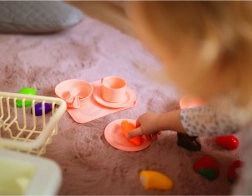 Sada obsahuje taniere, misky, hrnčeky, príbory, kanvičku, dosku na krájanie a plastové potraviny na suchý zips (ovocie a zelenina) na bezpečné „krájanie“. Deti si tak môžu pripraviť menu, naservírovať a potom riad umyť – od hry k zodpovednosti je len krôčik.